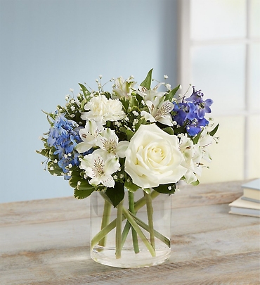 Our rustic, easy bouquet in shades of blue and white captures every wish you want to express to those who mean the most. Hand-designed inside a clear cylinder vase, its a gift that wont leave them wondering how you much you care.